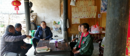 ▲在乡亲家中走访的杜海荣(中)